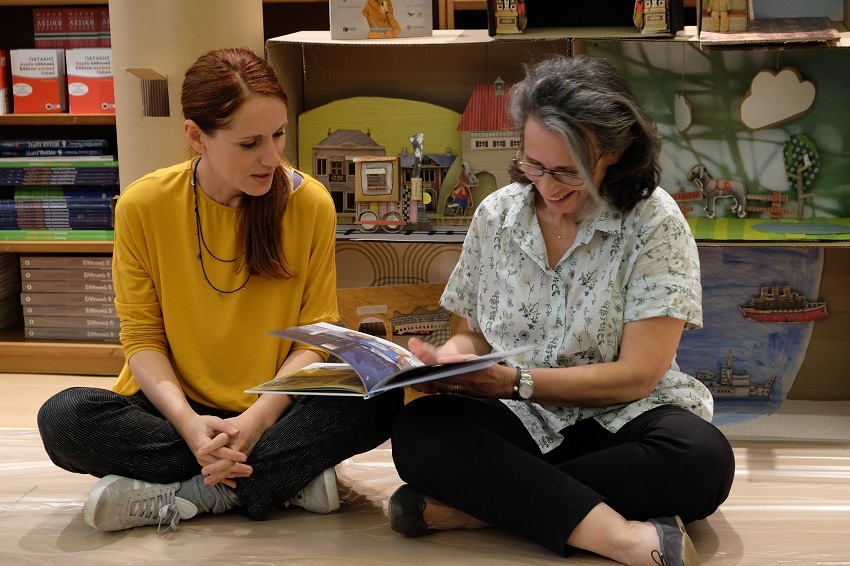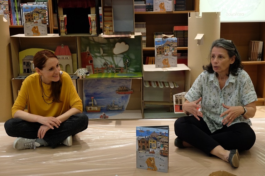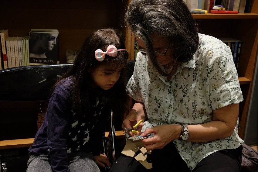 Η πρόσκληση δεν έλεγε πολλά πολλά για τα υλικά γιατί όλα ήταν εκεί, ξαπλωμένα, αραδιασμένα με χρωματικές διαβαθμίσεις, χαμογελαστά. Το μόνο που ζητούσε από εμάς είναι τη φαντασία μας, το κέφι μας, τη διάθεσή μας. Εκεί ήταν φυσικά και η Ελένη και η Ίρις, που χρόνια τώρα τον αγαπάνε και τον φροντίζουν. Μέρος συνάντησης, το βιβλιοπωλείο των εκδόσεων Πατάκης, στην Ακαδημίας.