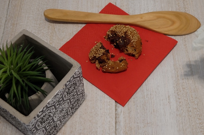 Ανακατεύουμε στο μίξερ το ταχίνι, το μέλι, τη βανίλια και τη μπανάνα. Προσθέτουμε τη σόδα, το αλάτι, το αλεύρι και ανακατεύουμε καλά. Τελευταία προσθέτουμε τη σοκολάτα. Πλάθουμε τη ζύμη σε μικρά μπαλάκια (αν θέλουμε προσθέτουμε το σουσάμι) και τα τοποθετούμε σε μια λαδόκολλα σε ταψί. Περίπου 20-24 μπαλάκια. Τα πιέζουμε από πάνω λίγο ώστε να γίνουν επίπεδα. Ψήνουμε στους 175 βαθμούς για 12-13 περίπου λεπτά