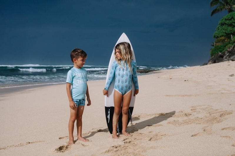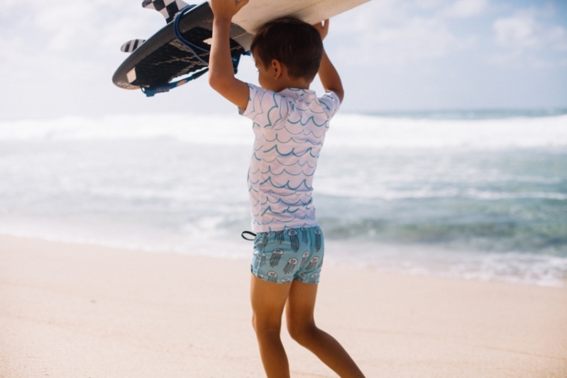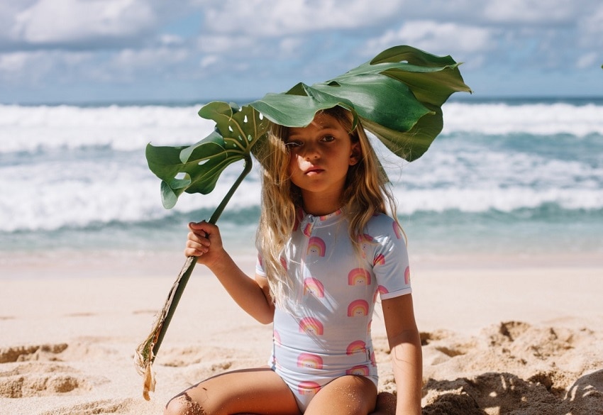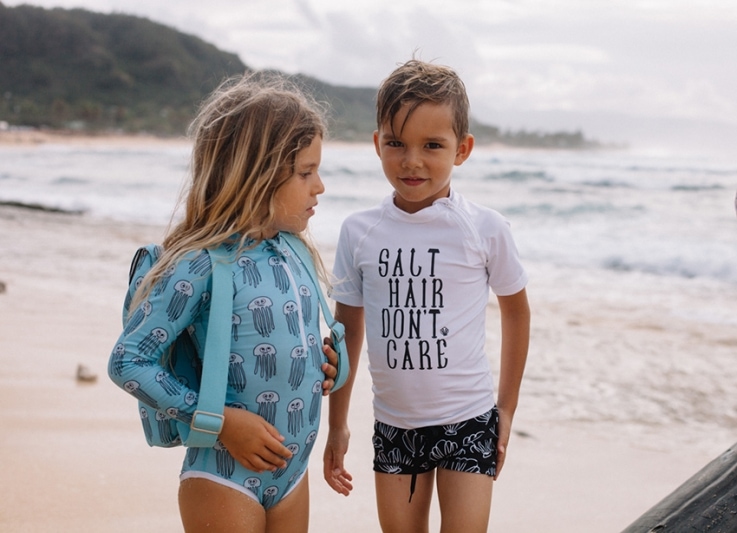 Και τώρα πάμε στο καλύτερο. Μαγιό, μπλούζες, ολόσωμα, poncho. Οι εταιρείες Beach & Bandits από την Ολλανδία, και Sunuva από την Αγγλία, χρησιμοποιούν υψηλής ποιότητας υφάσματα τα οποία αποκλείουν τον ήλιο με δείκτη προστασίας UPF50+, εμποδίζοντας πάνω από το 97,5% την βλαβερών ηλιακών ακτίνων να εισχωρήσουν και να φτάσουν το παιδικό δερματάκι.
